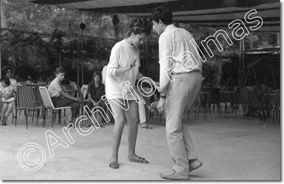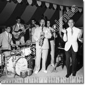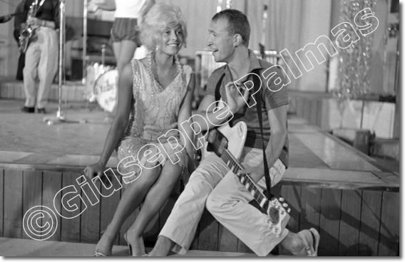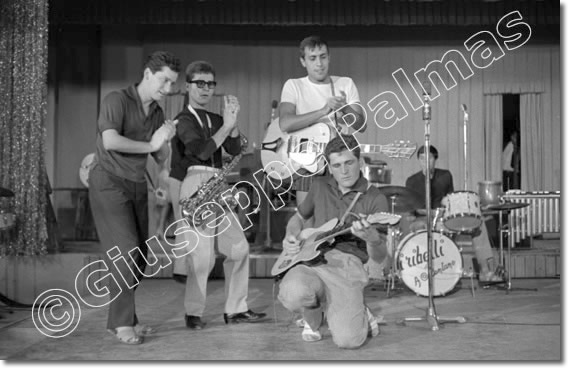 Jack la Cayenna, pseudonimo di Alberto Longoni, attore, ballerino e mimo italiano, con i Ribelli di Adriano Celentano - Bussola di Marina di Pietrasanta (Viareggio), agosto 1961